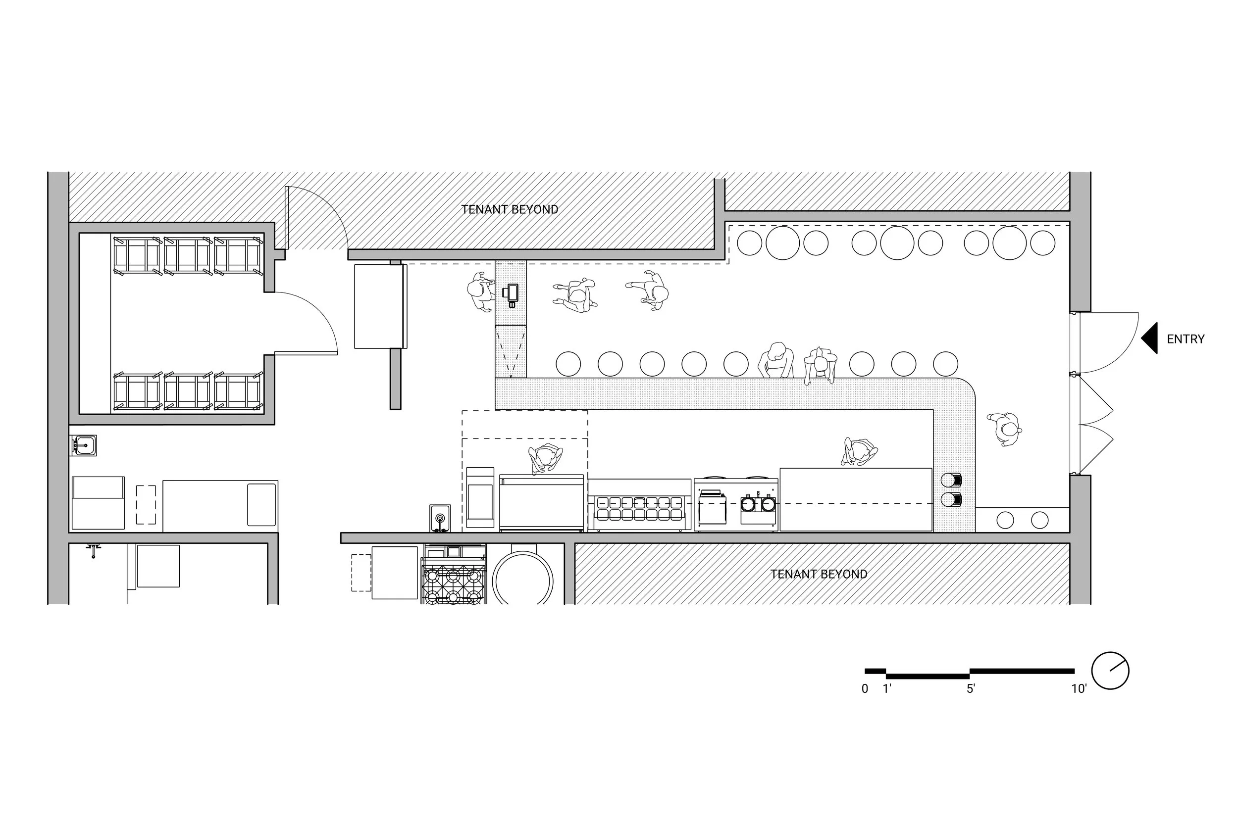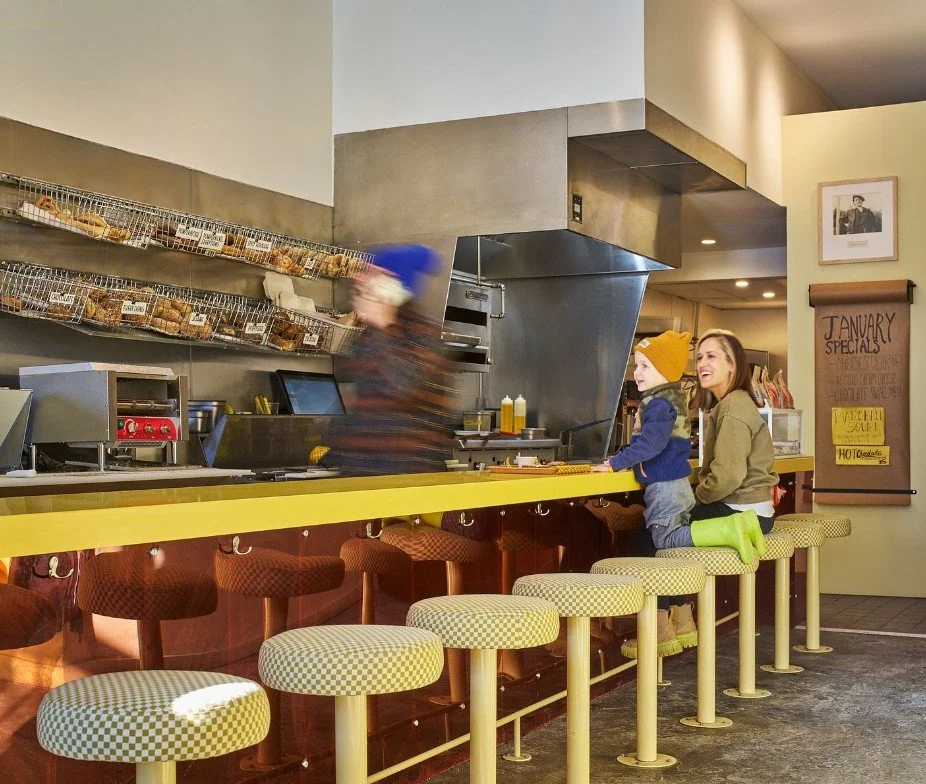Tasked with transforming an existing 250 sf grab & go storefront into a place that welcomed and held the bagel-loving community from both near and far, we implemented a classic diner bar in butter yellow. The result is a space where patrons can engage one another or the fun-loving staff making their sandwiches behind the bar.