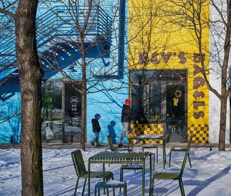 The warm yellow reaches the exterior of Bev’s Bagels, highlighting the space in the adjacent Core City Park.